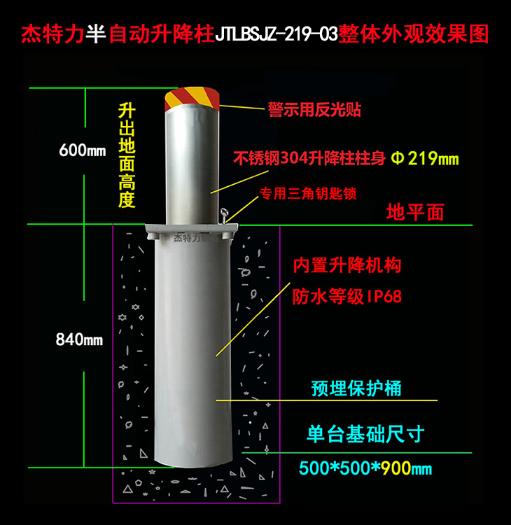 3、警示方式:升降柱的表面有50mm的反光識別帶作為警示,能夠被過往車輛的駕駛員明顯識別。